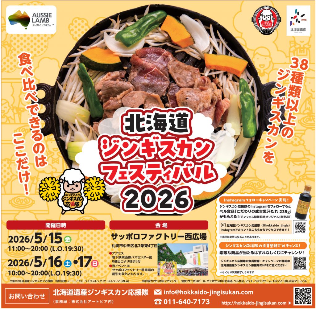 北海道遺産ジンギスカン応援隊では、全国各地の「ジンギスカン」38種類以上の食べ比べが楽しめるイベント「北海道ジンギスカンフェスティバル2026」を、サッポロファクトリー西広場で開催します。
